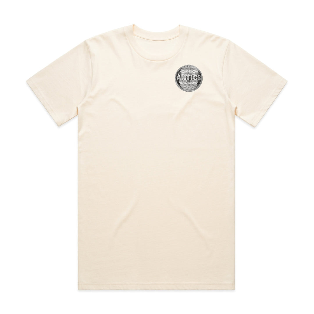 The ANTICS Disco Tee is a quiet nod to late-night dance floors, flashing lights and that golden era where music did the talking. Clean up front, bold out back - with a mirrored disco ball graphic that hits when you turn around.