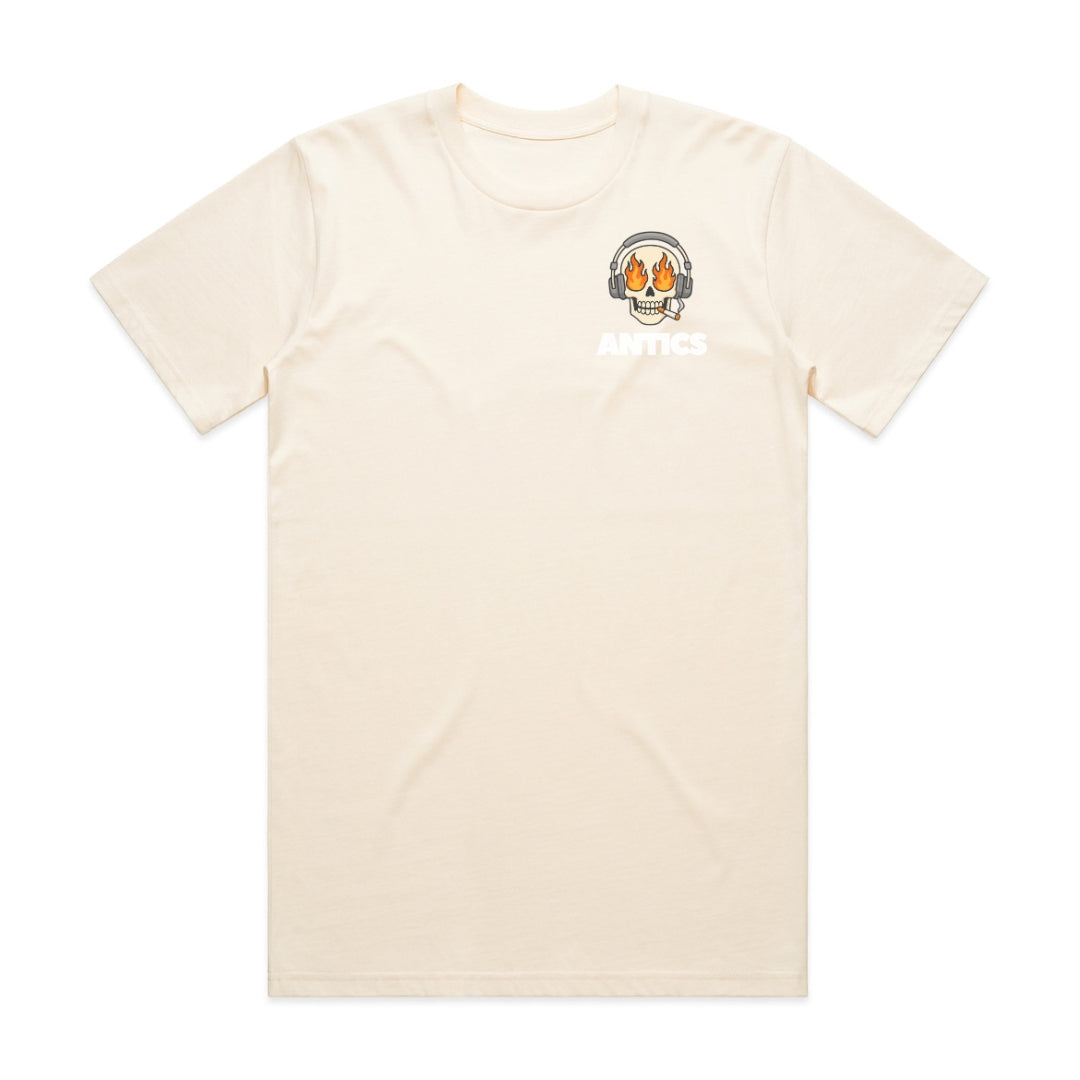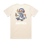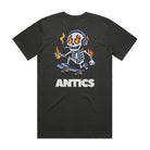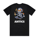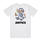 The SK8 Bones Tee is a statement piece - no question. With the signature ANTICS pocket logo on the front and a full-sized skeleton hitting the skate deck on the back (flames and headphones included), this tee brings pure chaos to clean streetwear.